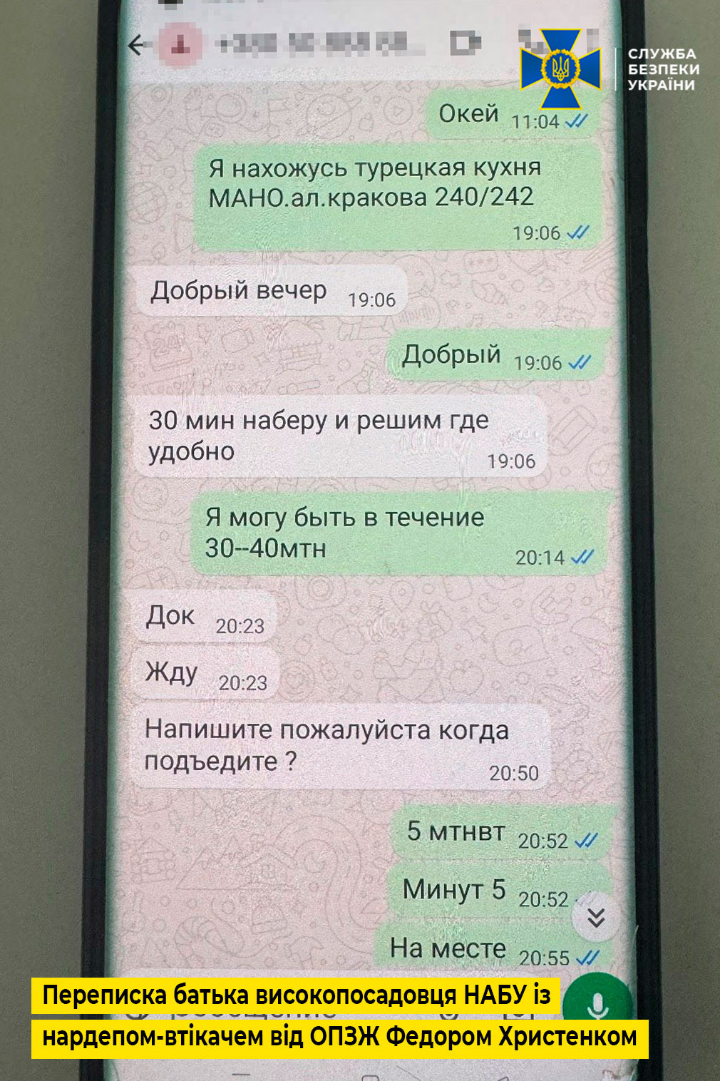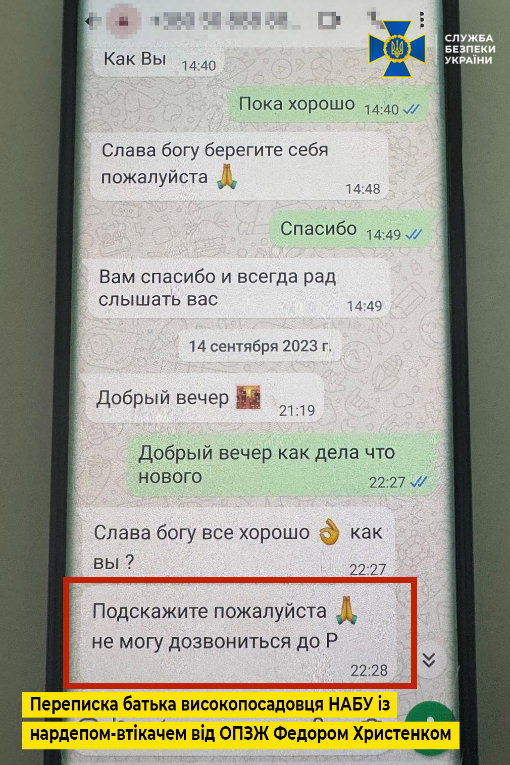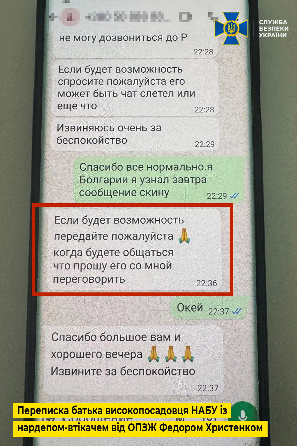 Також, як свідчать матеріали провадження, батько високопосадовця НАБУ вів листування з народним депутатом-втікачем від забороненої партії ОПЗЖ Федором Христенком, який за даними слідства пов’язаний зі спецслужбами рф та має значний вплив на діяльність НАБУ. Серед іншого, в одному з епізодів переписки вони домовлялися про зустріч на території ЄС. Про контакти співробітника антикорупційного Бюро з Христенком свідчить і листування біглого нардепа з батьком посадовця Бюро. Зокрема, Христенко писав про те, що не може додзвонитися до його сина (для конспірації він вказав лише першу букву імені) і просив посприяти налагодженню контакту.