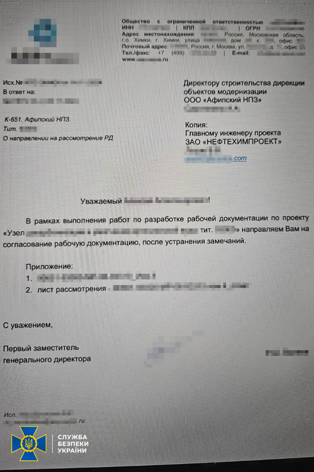 Як встановило розслідування, фігуранти виконували замовлення інжинірингового підприємства держави-агресора, яке займається реконструкцією підсанкційних пошкоджених російських нафтопереробних заводів.