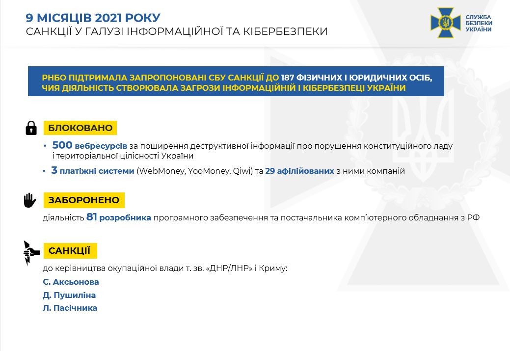 За матеріалами СБУ Рада національної безпеки і оборони запровадила санкції до 187 фізичних і юридичних осіб, які створювали загрози інформаційній та кібербезпеці нашої держави.