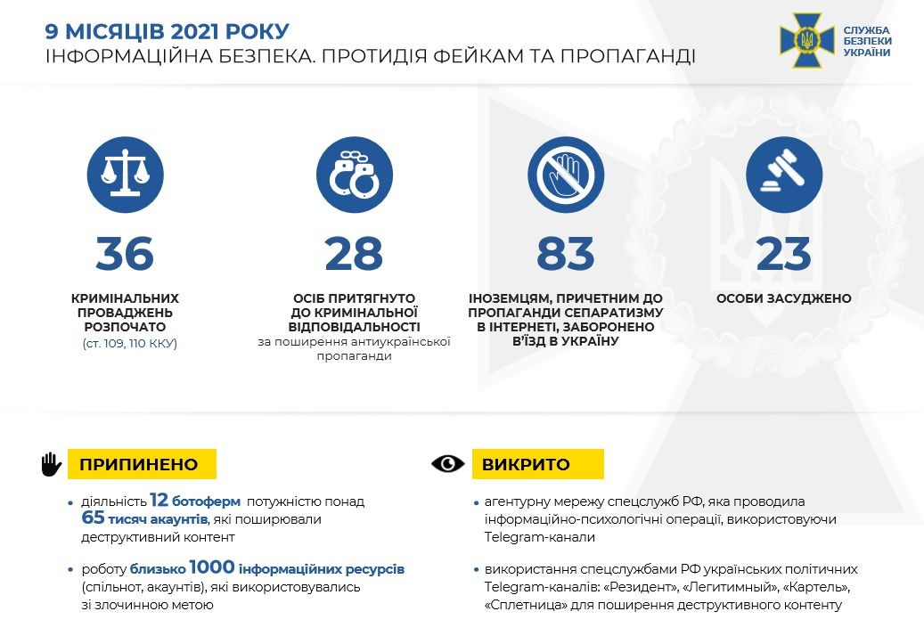 СБУ продовжує системно протидіяти інформаційно-підривній діяльності російських спецслужб. З початку року викрито більше ніж 30 ворожих інтернет-агентів, 23 з них засуджено за злочини проти держбезпеки України. Зловмисники закликали через соцмережі до захоплення влади та порушення територіальної цілісності нашої країни.