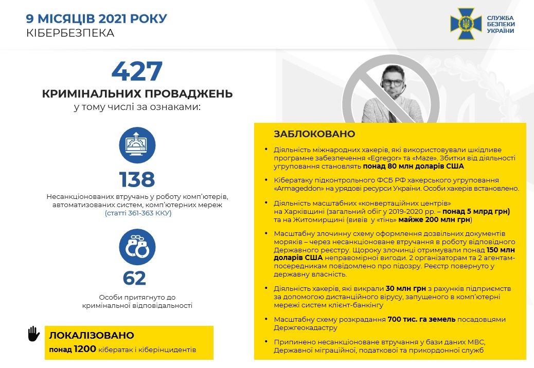 Крім того, СБУ встановила хакерів всесвітньо відомого угруповання Armagedon. Ними виявилися представники ФСБ РФ. Зловмисники здійснили понад 5 тисяч кібератак на державні органи та об’єкти критичної інфраструктури України.
