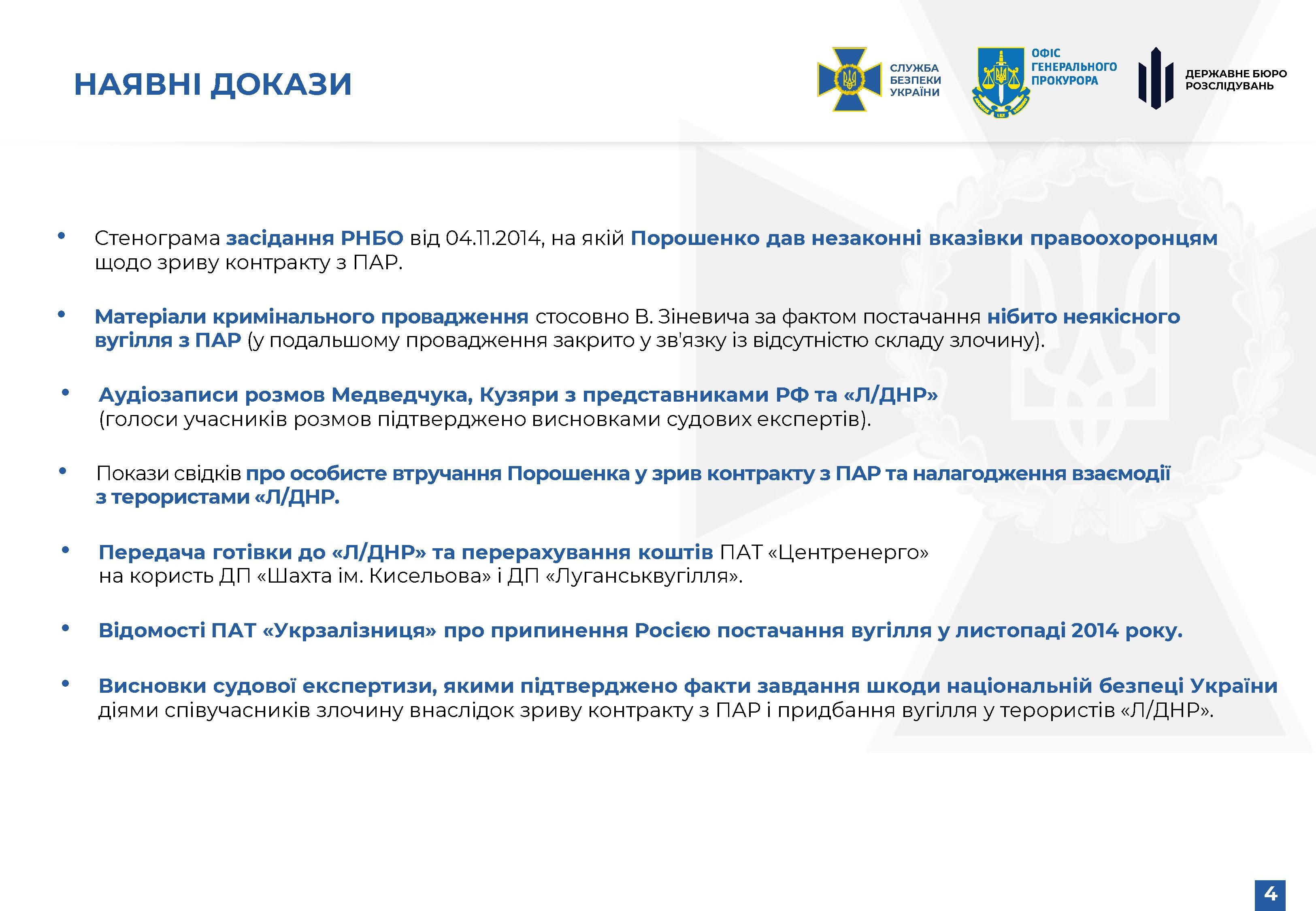 ‘Together, these pieces of evidence indicate that Petro Poroshenko, being the President of Ukraine at the time, used the powers and instruments of influence given to him to terminate contracts with the Republic of South Africa. And then, at the request of Russian representatives, he arranged the signing on behalf of Ukraine of contracts to supply coal from the uncontrolled territories,’ briefed Anatoliy Bulich, chief of directorate of the SSU Main Investigation Directorate.