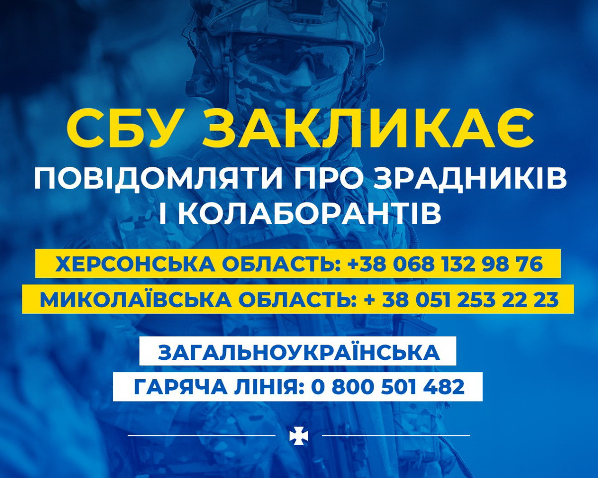 Dedicated hotlines operate in Kherson and Mykolaiv regions, through which you can report all information on traitors and collaborators who helped the enemy during the occupation:
