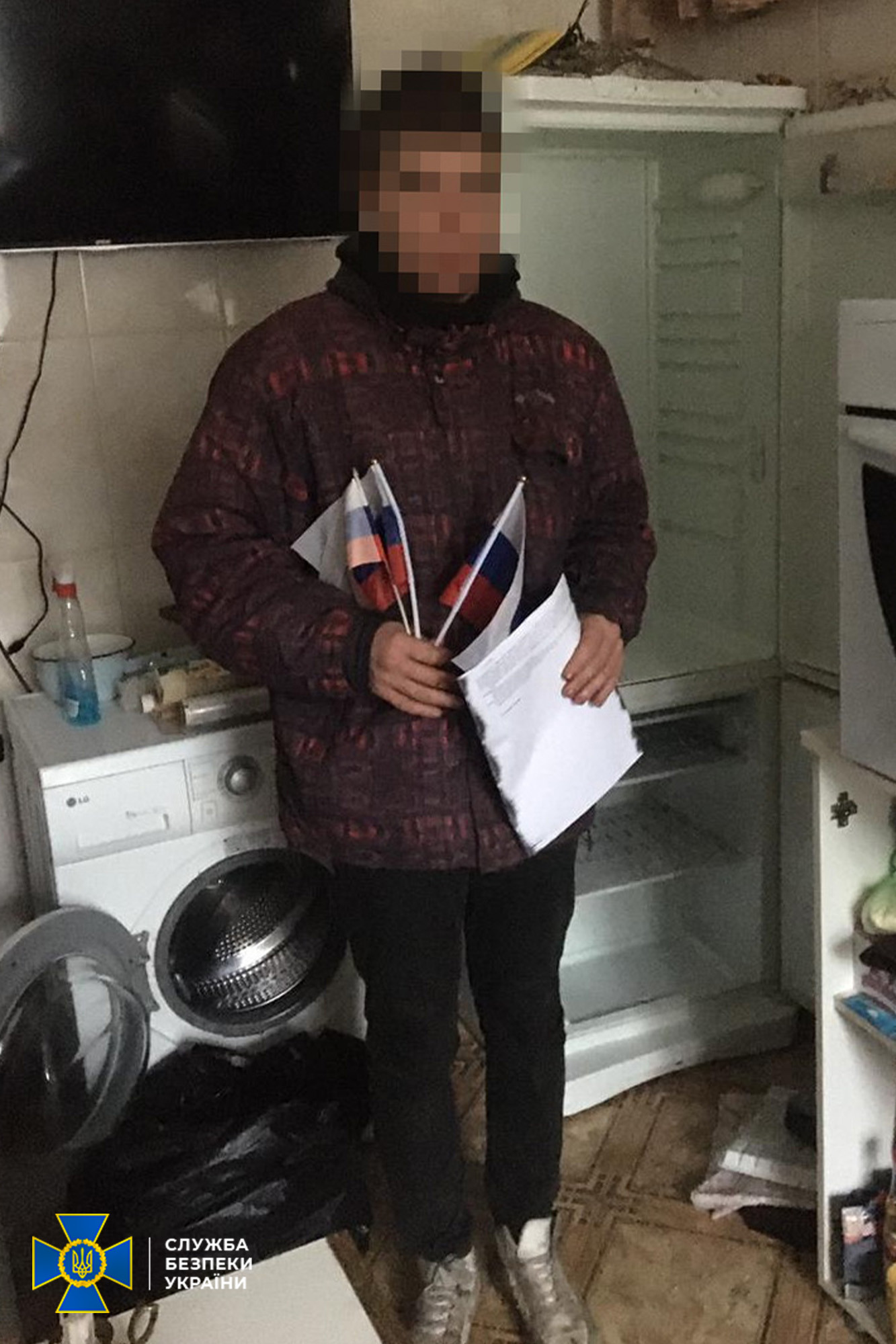During the search at the suspect’s home, the SSU found propaganda material, symbols of the aggressor state and a mobile phone with evidence of covert communication with the enemy.