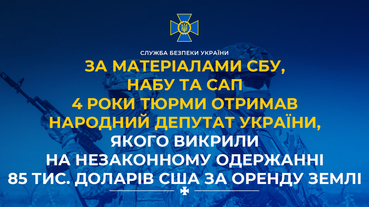 Based on SSU, NABU and SAPO investigation, Ukrainian MP, caught on USD 85,000 bribe for land lease, sentenced to four years in prison