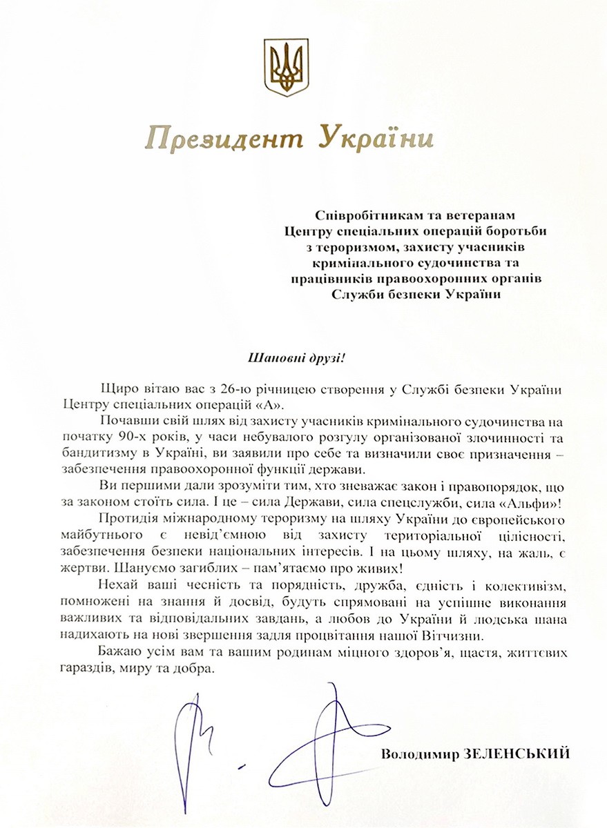 Вітання Президента України співробітникам та ветеранам Центру спеціальних операцій «А» Служби безпеки України
