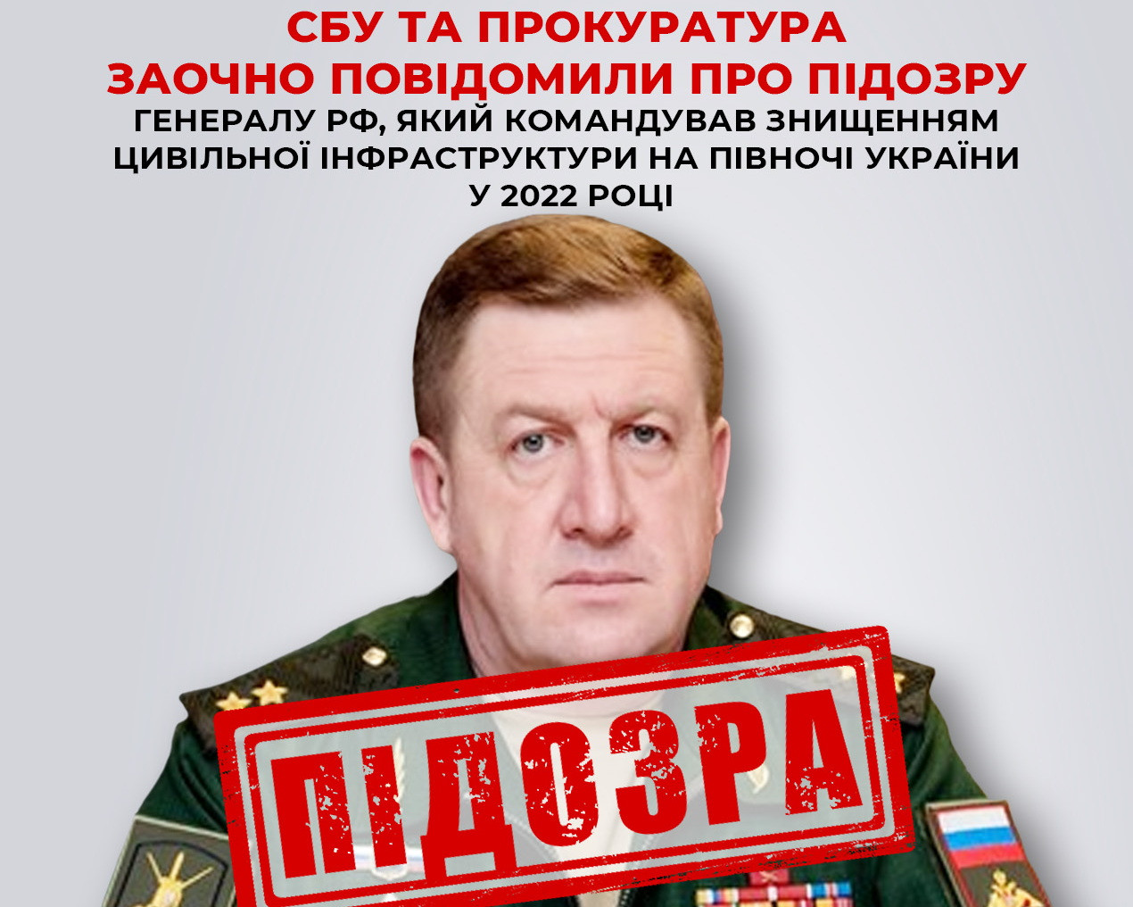 СБУ та прокуратура заочно повідомили про підозру генералу рф, який командував знищенням цивільної інфраструктури на півночі України у 2022 році