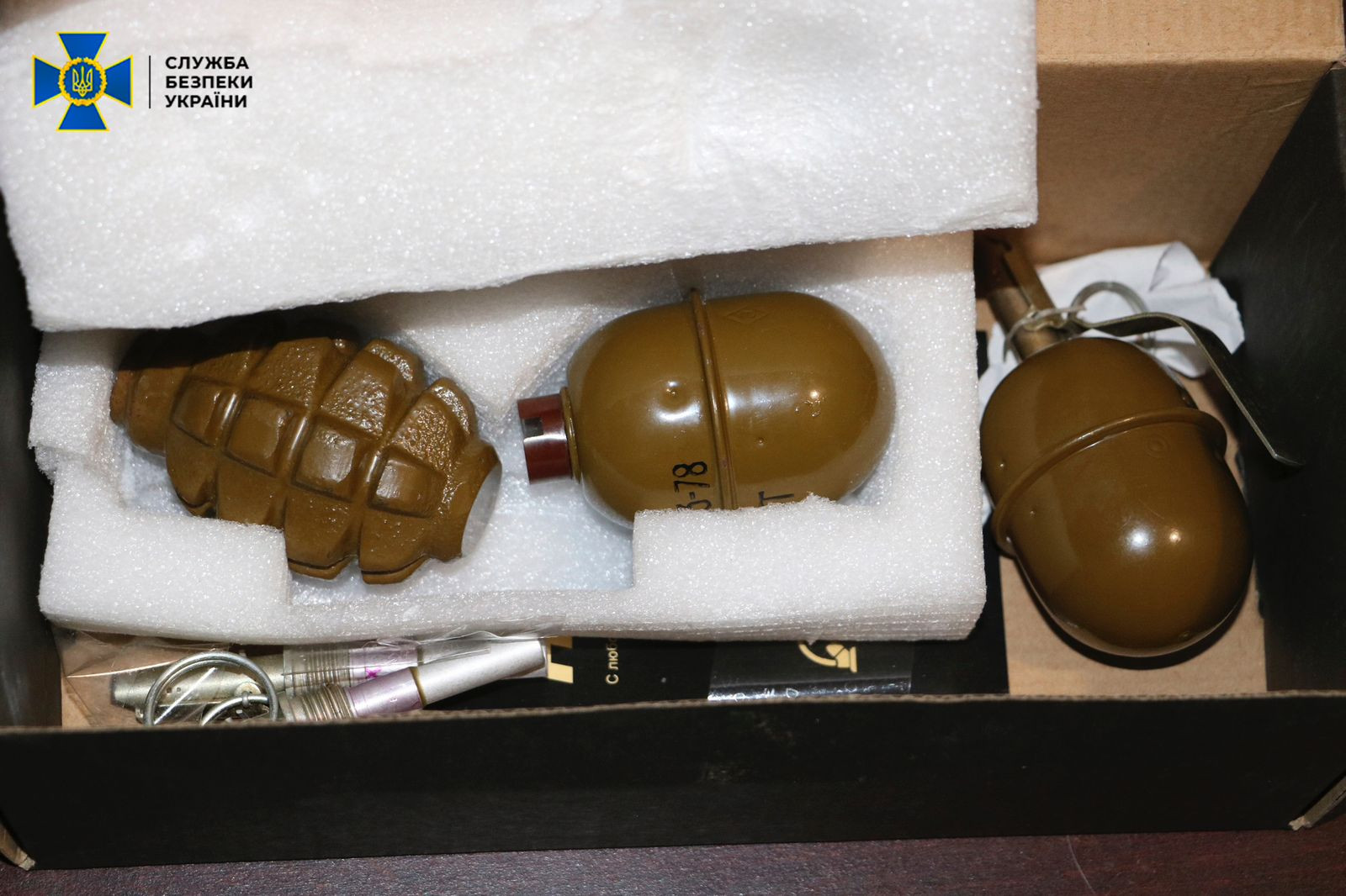 Під час обшуків у помешканнях затриманих виявлено комп’ютери та мобільні телефони, які вони використовували для проведення розвідувально-підривної діяльності проти України. Також у них вилучено три бойові гранати.
