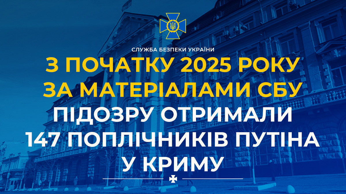 За матеріалами Служби безпеки України з початку 2025 року повідомлено про підозру 147 особам, які поширюють кремлівський режим у тимчасово окупованому Криму. Також цього року за злочини на півострові засуджено 32 фігуранти.