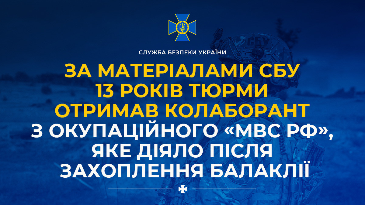За матеріалами СБУ 13 років тюрми отримав колаборант з окупаційного «мвс рф», яке діяло після захоплення Балаклії